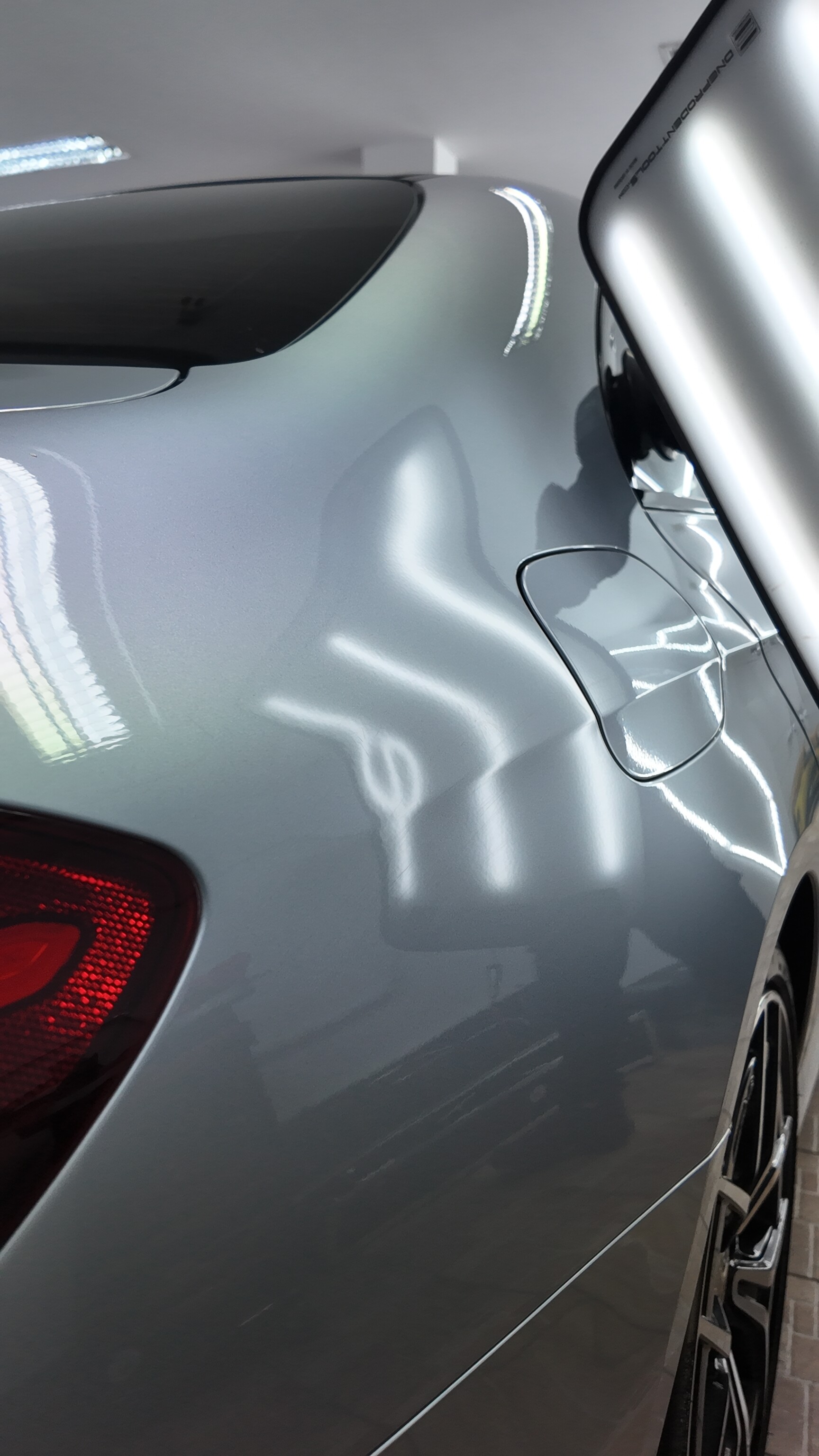 Naprawa wgniecenia na tylnym nadkolu, z zachowaniem oryginalnego lakieru i wysokiej wartości rynkowej pojazdu.